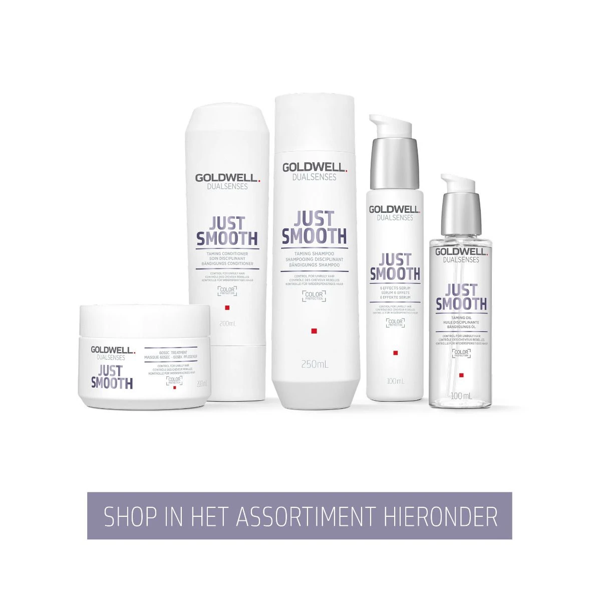 Goldwell Dualsenses Just Smooth geeft het haar meer handelbaarheid, pluiscontrole en een uitzonderlijke glans een zacht haargevoel. De Goldwell Dualsenses Just Smooth producten zijn geschikt voor het weerbarstige en pluizige haar. De Kukui-noot olie staat bekent om haar vocht verlenende effect. De combinatie van actieve ingrediënten ondersteunt de gelijkmatige egalisatie van het haaroppervlak en de haarstructuur.
