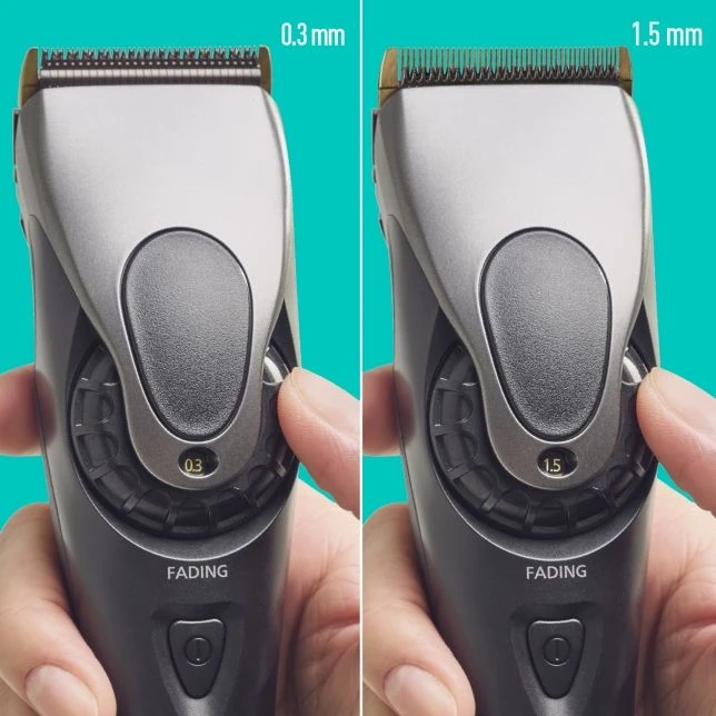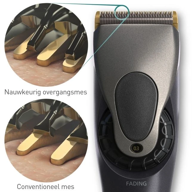 De tondeuse bevat een li-ion batterij die in 1 uur vol geladen is en die hierna 50 minuten non-stop te gebruiken is. Dankzij de 4 opzetkammen bepaal je zelf voor welke lengte je gaat. Er zit één fading hulpstuk in en drie kammen van 3/4mm, 6/9mm en 12/15mm. De tondeuse is instelbaar van 0,3 tot 1,5mm in vijf stappen van 0,3mm zonder opzetkam.