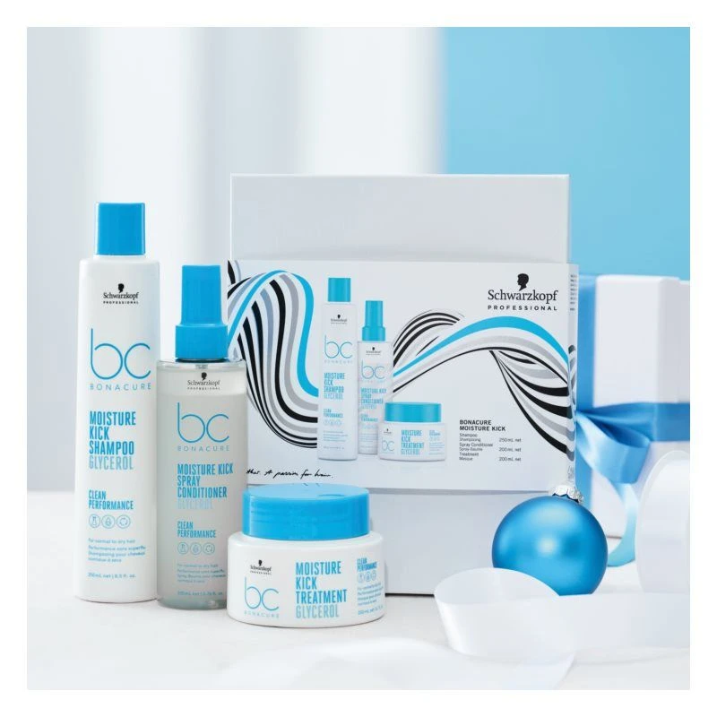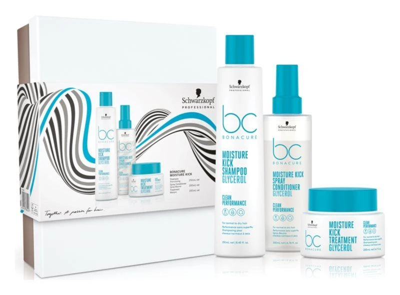 De BC Moisture Kick Giftset van Schwarzkopf is de perfecte set voor droog en krullend haar. De producten in deze set zorgen ervoor dat het haar weer wordt gevoed en zijn elasticiteit terug krijgt. De set bevat de Schwarzkopf BC Moisture Kick Shampoo, Schwarzkopf BC Moisture Kick Spray Conditioner en Schwarzkopf BC Moisture Kick Treatment.